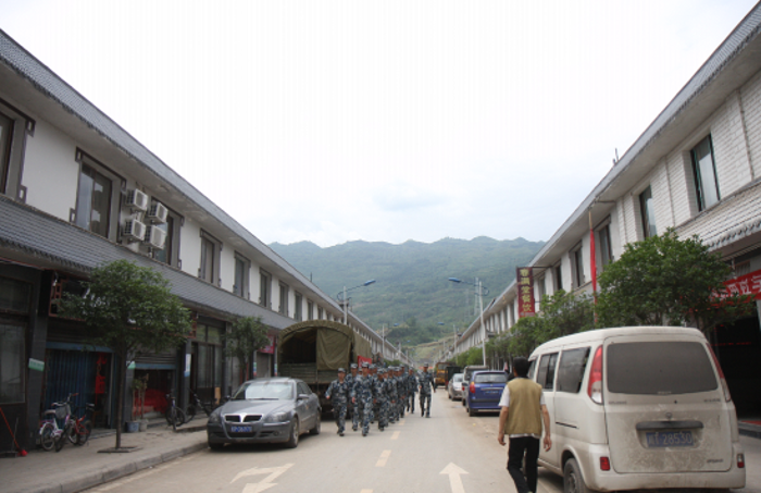 本次地震的宏观震中位于芦山县龙门乡。其整条政府新街的房屋,由于是2008年汶川地震后恢复重建的建筑,虽然本地地震烈度较高(Ⅸ度区),但是所有建筑破坏较轻,震后民众马上恢复了正常生活状态。但是相邻的老街大多数是自建民居,建设的随意性使得抗震能力参差不齐,不少房屋发生了中等及以上的破坏。