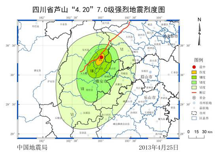 图1 四川省芦山7.0级地震Ⅵ度及以上地区分布