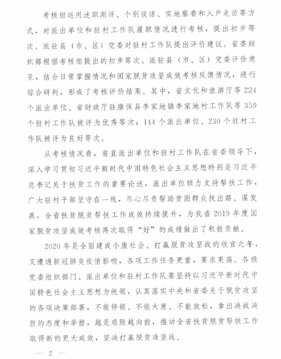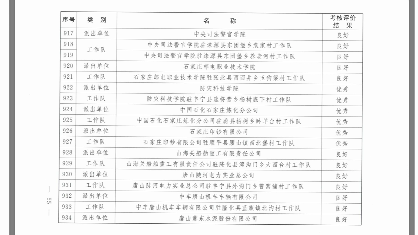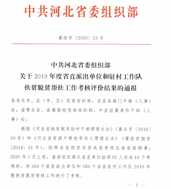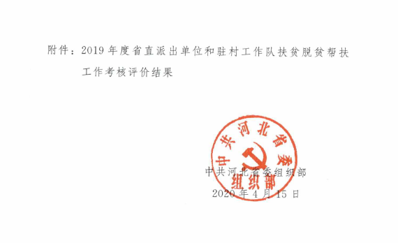 在中共河北省委组织部关于2019年度省直派出单位和驻村工作队扶贫脱贫帮扶工作考核评价中,学校和学校派驻杨树底下村驻村工作队均被评为优秀。