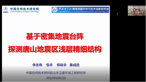 李志伟研究员从唐山地震的地质和地球物理背景、造成的灾害情况、密集地震台阵成像方法、唐山地震区浅层精细结构成像、浅层成像结果所揭示的问题等几个方面详细介绍和讨论,特别是对研究沉积层结构的各种方法及其各自的优势和不足进行了细致讲解,对于唐山地震断层处存在百米的沉积层变化进行了详细讨论。会后,李志伟研究员与参会人员就沉积层厚度成像的前沿问题以及唐山地震的相关问题进行了交流与探讨。