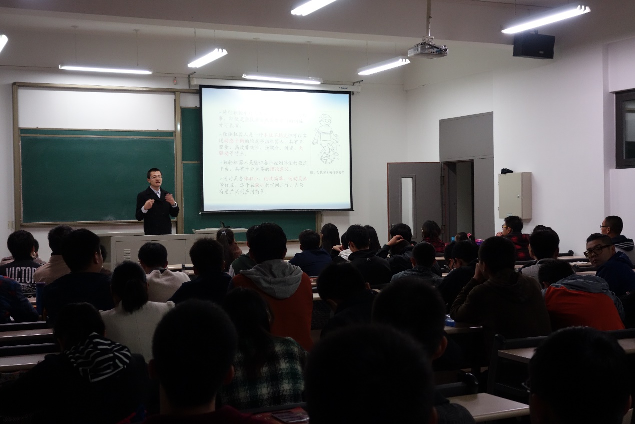 朱晓庆副教授结合自身的学习经历和科研经历及当前独轮车发展的水平,以独特的方式向学生介绍了独轮机器人的设计过程、独轮机器人的控制实现。他结合防灾仪器系各专业情况,进一步介绍了专业知识在机器人中的应用。同时结合自身发展的经历,给学生在个人发展规划方面提出了切实可行的建议。