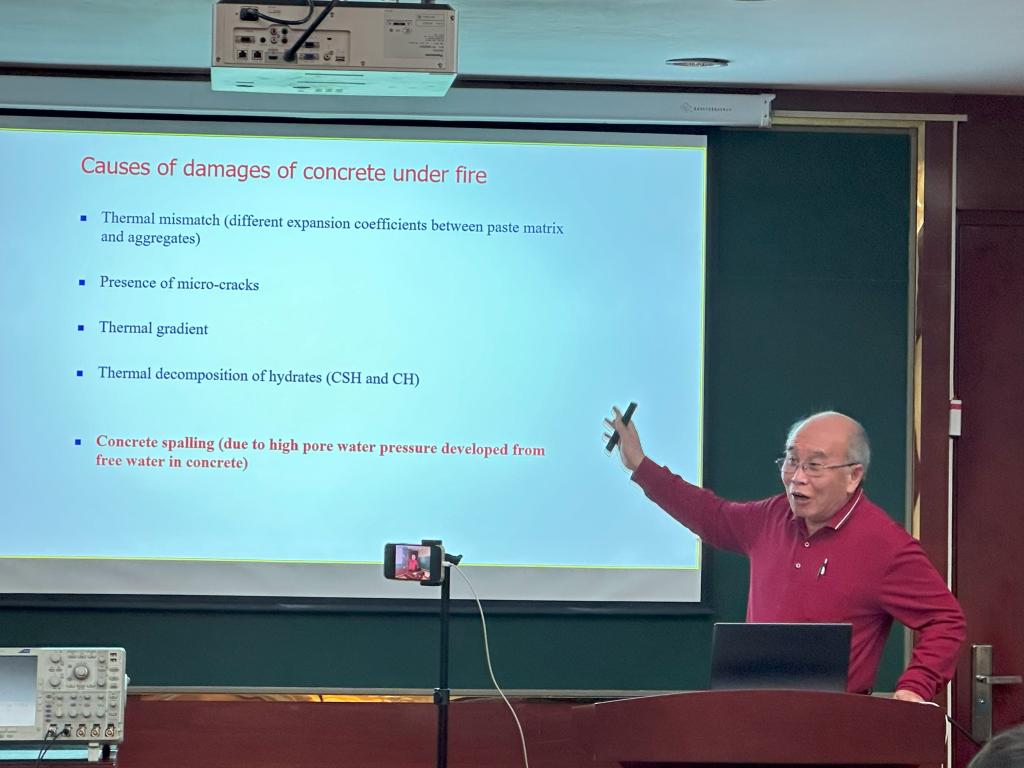 黄玉龙教授分别做了“Different Methods to Improve Performance of Concrete under Fire, and Quantify Residual Properties of Fire-damaged Concrete in Buildings”和“Detachment of Tiling Systems of Building Walls and Efflorescence at External Walls: Common Causes and Methods of Repair”两个主题报告。在第一个报告中,黄教授分享了其对香港某个遭受火灾的建筑的调研结果,介绍了不同温度下混凝土和钢筋的强度损失程度、混凝土在火灾下出现剥离现象的原因,并对不同改善建筑抗火性能的应对方法进行了评价。在第二个报告中,黄教授分别对建筑外墙瓷砖出现脱落现象的原因、快速检测瓷砖空鼓的方法、瓷砖与混凝土基底粘接的不同形式和如何防治瓷砖空鼓现象四个方面做了详细介绍。