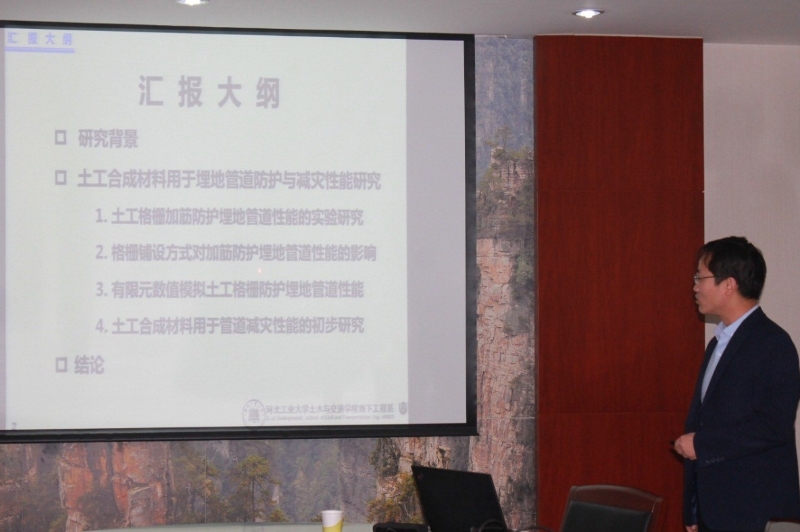 12月2日,河北工业大学土木与交通学院肖成志教授应邀到校作学术报告并开展学术交流活动。肖教授报告题目为“土工合成材料用于埋地管道防护与减灾的性能研究”。报告主要介绍了土工合成材料加筋防护埋地管道性能实验、有限元数值模拟以及土工合成材料用于管道减灾的初步研究。