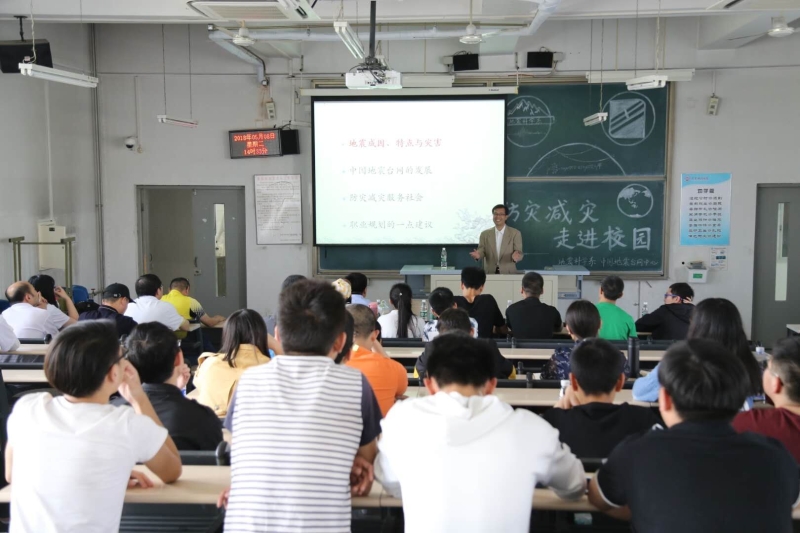 黄志斌研究员做了题为《防灾减灾、走进校园》的报告,报告用深入浅出的语言,分析了地震灾害成因及当前特点,介绍了中国地震台网发展的最新成果,强调了防灾减灾的社会服务功能,并就防灾科技学院学生的职业规划提出了建议。