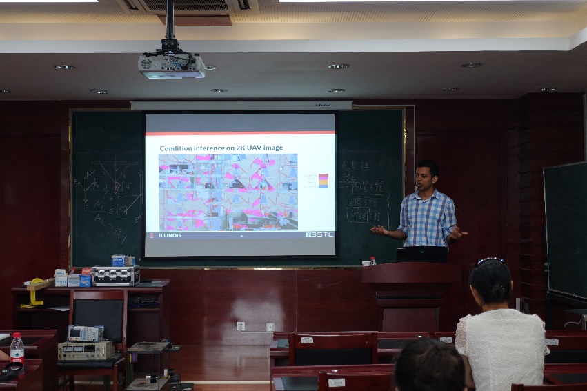 8月13日,应土木工程学院郭迅教授邀请,美国伊利诺伊大学土木与环境工程系Vedhus Hoskere博士来校作题为“Towards Automated Structural Inspection with Deep Learning and Unmanned Aerial Vehicles”的学术报告。我校部分教师、研究生和本科生参加了本次报告会。