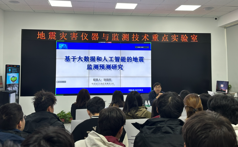 10月28日上午,中国地震局地震预测研究所张晓东研究员应邀作题为“基于大数据和人工智能的地震监测预测研究”的学术报告,该报告是电子科学与控制工程学院举办的“河北省地震灾害仪器与监测技术重点实验室2024系列学术报告”中的第9场。报告在地震监测预警综合服务基地地震监测四网孪生实验室举行,会议由电控学院院长蔡建羡主持,学校部分师生聆听了报告。
