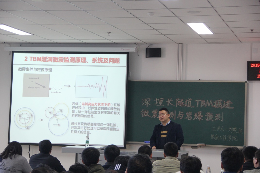 10月30日下午,清华大学河川枢纽与建设管理研究所副所长刘晓丽研究员应邀作“深埋长隧道TBM掘进微震监测与岩爆预测”学术报告。地质工程学院和其它部门的师生聆听了报告。
