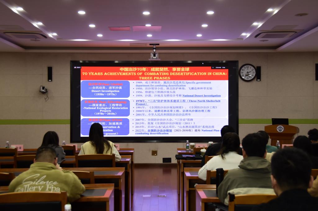 王锋从中国风沙灾害治理的历程出发,剖析了风沙灾害治理不同阶段的理念与技术的发展与变化,并展示了中国风沙灾害治理的典型案例。会上,王锋还分享了本人参与风沙治理的心得体会以及所在单位在中国风沙灾害治理中所做的重要工作与成绩。