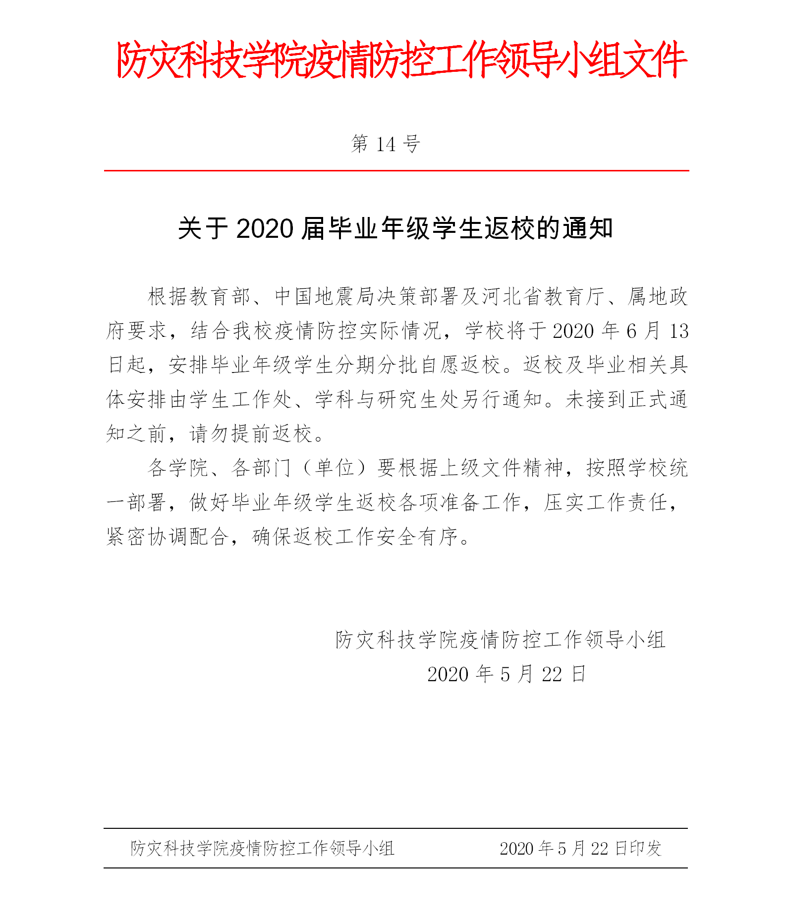 关于2020届毕业年级学生返校的通知