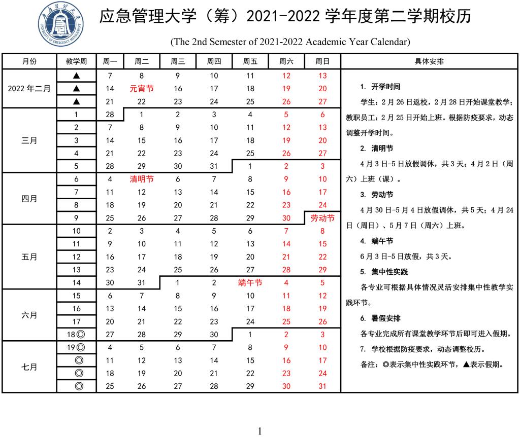 《应急管理大学(筹)2021—2022学年度第二学期校历》现予以公布,请遵照执行,并安排好相关工作。