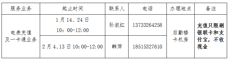 (二)家属区预付费电表充值预约及一卡通业务办理。