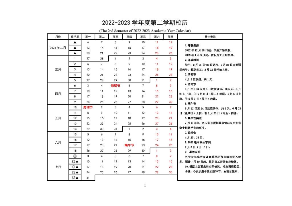 《2022—2023学年度第二学期校历》已经2022年第23次校务会讨论通过,现予以公布,请遵照执行,并安排好相关工作。