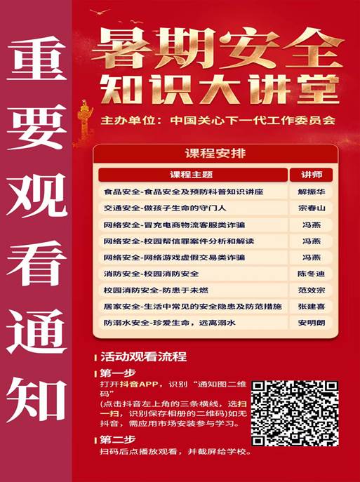 为进一步加强广大师生的安全防范意识,提高安全能力,中国关心下一代工作委员会健康体育发展中心利用网络直播或视频合集形式开展“中国校园安全健康行动”主题讲座活动。