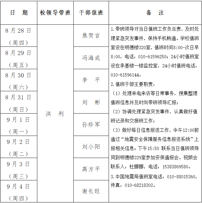 为贯彻落实中国地震局《中国人民抗日战争暨世界反法西斯战争胜利80周年纪念活动地震安全保障服务实施方案》的通知要求,地震安保时段为8月29日至9月4日,现安排值班工作如下: