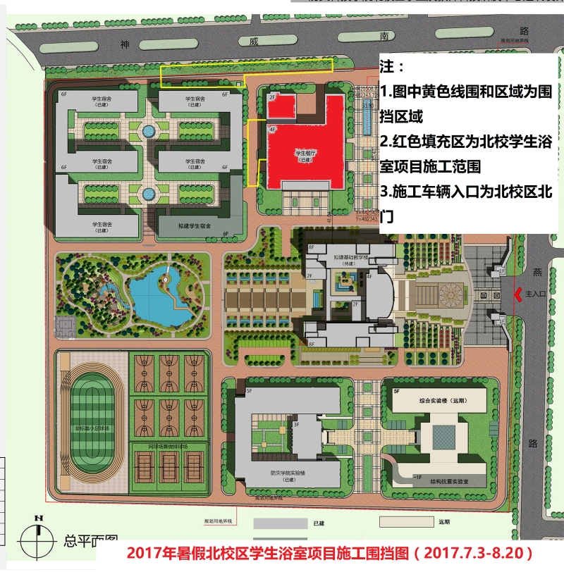 按照学院部署,今年暑假进行北校区学生浴室基础设施及附属热源系统改造项目施工,施工时间为2017年7月3日-2017年8月20日,围挡区域见下图。