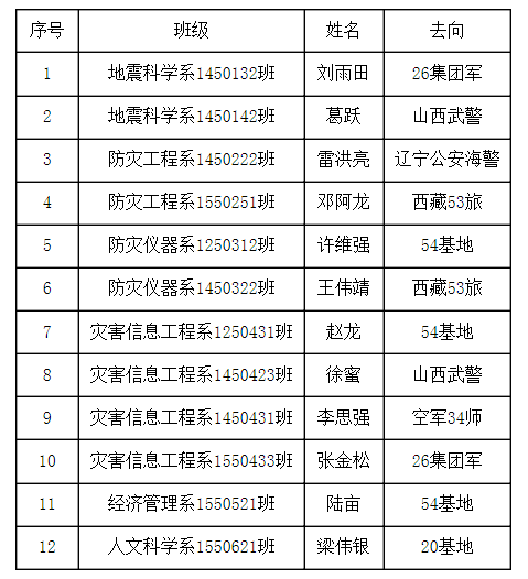 在学院领导高度重视和支持下,在各系、各有关部门的大力配合下,我院2016年大学生征兵工作圆满完成。经过预报名、初审、体检、复检、心理检测、政治审查等程序的严格筛选,我院共有12名大学生光荣入伍,现予以公示。如有异议,请于公示期内以电话、来访或书面形式向防灾科技学院招生就业处(010-61596244)或审计监察处(010-61596110)反映。以书面形式反映应署真实姓名。