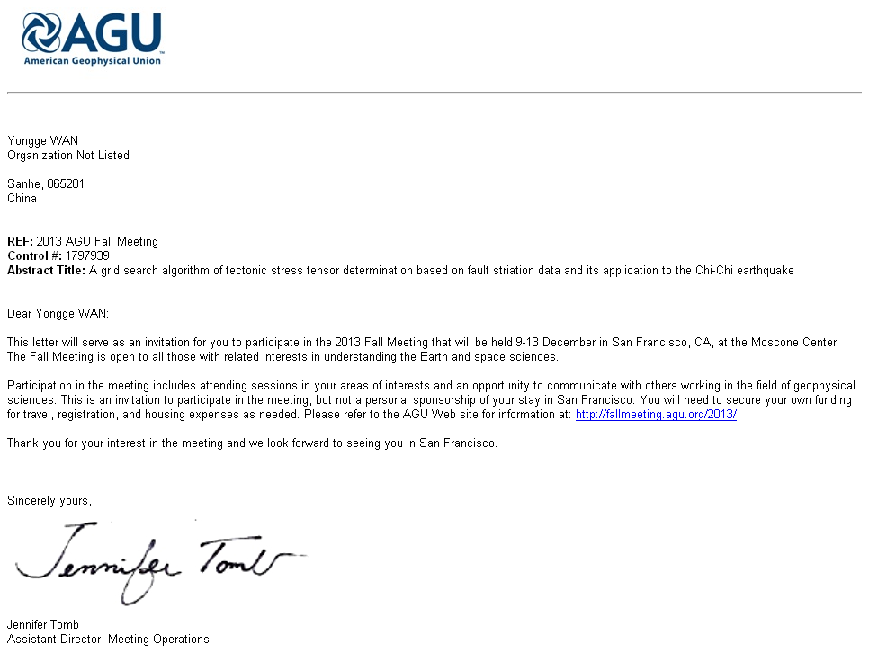 根据中国地震局“2013年外事计划”,经个人申请、学院上报,中国地震局审批,拟派出万永革同志于2013年12月赴美国旧金山(San Francisco, US)参加2013年美国地球物理联合会学术会议(AGU)。该会议是一项全球性的地球物理学术讨论会,该讨论会致力于全球地球科学家讨论研究地球与空间科学关系的前沿问题。该会议研究水平高、规模大,在国际地震学界具有较高声誉。该会议为各高校、研究机构等学术团体在地球物理及防灾减灾研究领域的沟通与合作,探索新的研究方向和合作领域提供了广阔的交流平台,进一步促进与会代表之间建立起更加稳定和持续的合作关系,进一步推动地球科学问题研究的国际化合作水平。