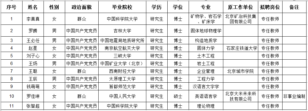 根据《事业单位公开招聘人员暂行规定》(人事部第6号令)、《防灾科技学院公开招聘人员暂行办法》(防科发人〔2018〕119 号)、《防灾科技学院硕士研究生以上非事业编制人员管理办法(试行)》(防科发人〔2019〕60号),经考核,拟聘用李真真等11人为防灾科技学院工作人员,现予公示。如对拟聘人员有异议,请于公示期内以电话、来访或书面形式向防灾科技学院人事处(010-61596031)或审计监察处(010-61596110)反映。以书面形式反映应署真实姓名。公示期2020年3月10日至2020年3月17日。
