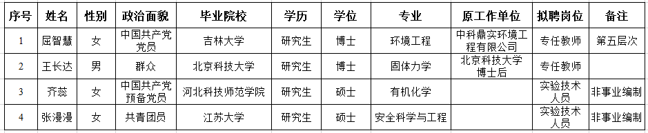 根据《事业单位公开招聘人员暂行规定》(人事部第6号令)、《防灾科技学院公开招聘人员暂行办法》(防科发人〔2018〕119 号)、《防灾科技学院硕士研究生以上非事业编制人员管理办法(试行)》(防科发人〔2019〕60号),经考核,拟聘用屈智慧等4人为防灾科技学院工作人员,现予公示。如对拟聘人员有异议,请于公示期内以电话、来访或书面形式向防灾科技学院人事处(010-61596031)或审计监察处(010-61596110)反映。以书面形式反映应署真实姓名。公示期2020年4月23日至2020年4月30日。
