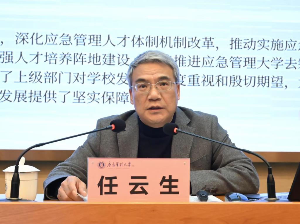 任云生传达学习贯彻2025年全国两会期间习近平总书记关于教育、科技、人才一体化发展的重要讲话精神,结合《教育强国建设规划纲要(2024—2035年)》的部署要求,分析了学校高质量发展和大学筹建面临的新形势新任务,进一步明确了学校内涵建设和高质量发展的目标任务,系统部署了学校2025年5方面19项重点工作。一是强化政治引领,筑牢党的全面领导根基。要坚持以党的政治建设为统领,夯实党建引领坚实基础,严守意识形态工作前沿阵地,不断强化思想政治工作力度。二是聚焦大学筹建,全力弥补办学条件短板。要弥补关键短板改善办学条件;稳步推进学校深度融合进程;做好教育部专家进校评审准备。三是深耕内涵建设,增强支撑应急事业能力。要科学谋划事业发展规划,提高学科专业实力,提高科技创新能力,提高教育培训实效,提高师资队伍水平。四是打造和谐校园,提高育人服务保障水平。要深入推进治理体系改革,持续改善学校办学条件,深化落实平安校园建设。五是全面从严治党,营造风清气正的校园环境。要加强学生教育管理,落实主体责任,增强监督效能,严格执纪问责。