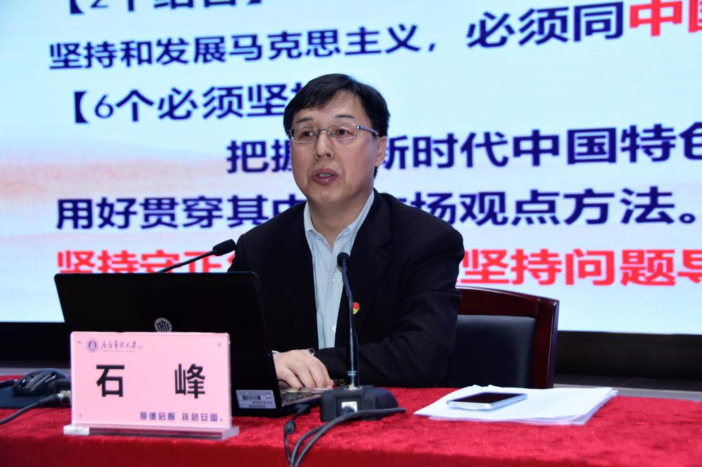 石峰以“自信自立走好中国式现代化道路”为题,从“新时代新征程新伟业——重温党的二十大精神、中国式现代化何以自信”两个方面,领学了党的二十大报告的重点内容,聚焦应急管理体系和能力现代化进行了深入解读,通过应急救援典型案例和数据分析,深刻阐释了中国共产党坚持人民至上、生命至上的价值理念和中国特色社会主义制度的显著优越性,深入诠释了以中国式现代化推进中华民族伟大复兴的高度自信,号召广大青年学子牢记总书记的嘱托,坚定不移听党话、跟党走,立志做有理想、敢担当、能吃苦、肯奋斗的新时代好青年,坚定信心,锤炼本领,为全面建设社会主义现代化国家、全面推进中华民族伟大复兴贡献力量。