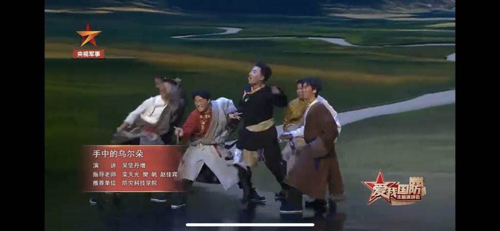 2月16日晚,由中央宣传部宣传教育局(全民国防教育局)、中央军委国防动员部政治工作局、中央广播电视总台军事节目中心联合主办,中央广播电视总台军事节目中心制作的特别节目《爱我国防》主题演讲会在CCTV-7国防军事频道、学习强国、央视频等平台正式播出,学校原创编排、19位学生参演的《手中的乌尔朵》《回答》2个作品亮相舞台,作为9个参演节目中仅有的大学生代表,向全国观众讲述新时代国防故事、传播新时代国防声音。2023年6月以来,《手中的乌尔朵》《回答》在廊坊市、河北省“爱我国防”主题演讲比赛中屡获佳绩,分别由应急管理部、河北省委宣传部选送至中宣部宣教局参加全国展演。2个作品的节目内容、形式和质量受到央视导演组的高度赞扬,认为“节目是整台晚会的亮点,引领了演讲艺术形式的新高度”。央视新闻报道,“《爱我国防》主题演讲会突破传统演讲模式,将演讲与戏剧、歌舞等多种艺术形式相结合……藏族大学生吴坚丹增和他的同学把独具民族特色的舞蹈表演融入演讲……情景演讲《回答》通过一对恋人跨越时空的对话,讲述肖思远从一名青年学生到一名戍边战士的蜕变……”。学校和教师创作团队也受到了节目组的充分肯定。防灾科技学院在鸣谢单位中名列第一,指导教师樊帆、栾天光被署名戏剧导演,单独署名樊帆为编舞、栾天光为舞蹈排练,指导教师张振、赵佳宾被列入撰稿组,节目主持人康辉、周瑜在我校校旗上签名留念,演讲者吴坚丹增和季子博作为演员代表先后接受“学习强国”军事频道、中国人民解放军新闻传播中心“中国军号”等多家媒体采访。