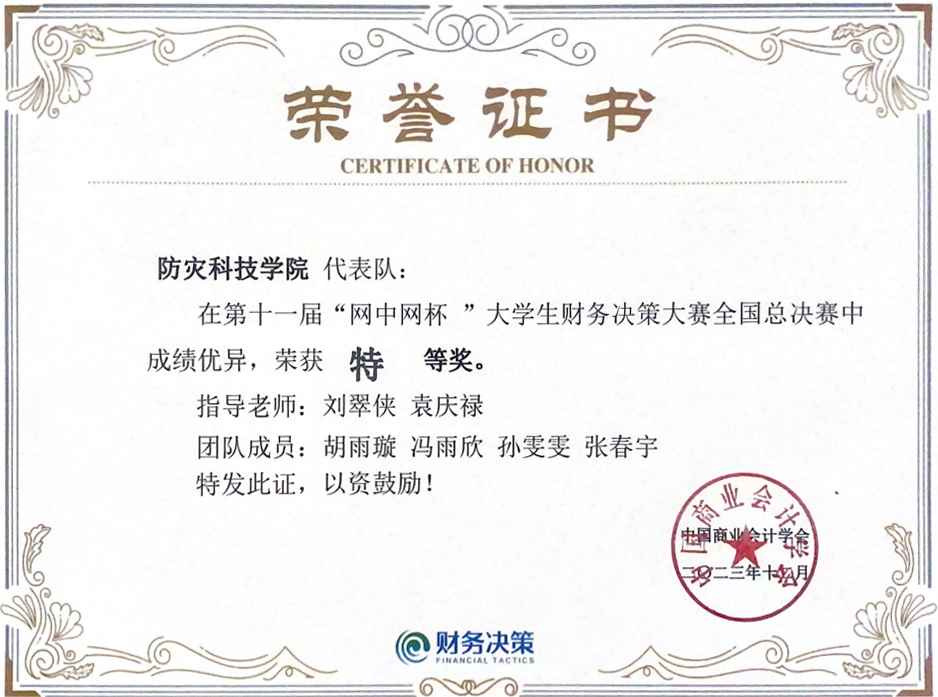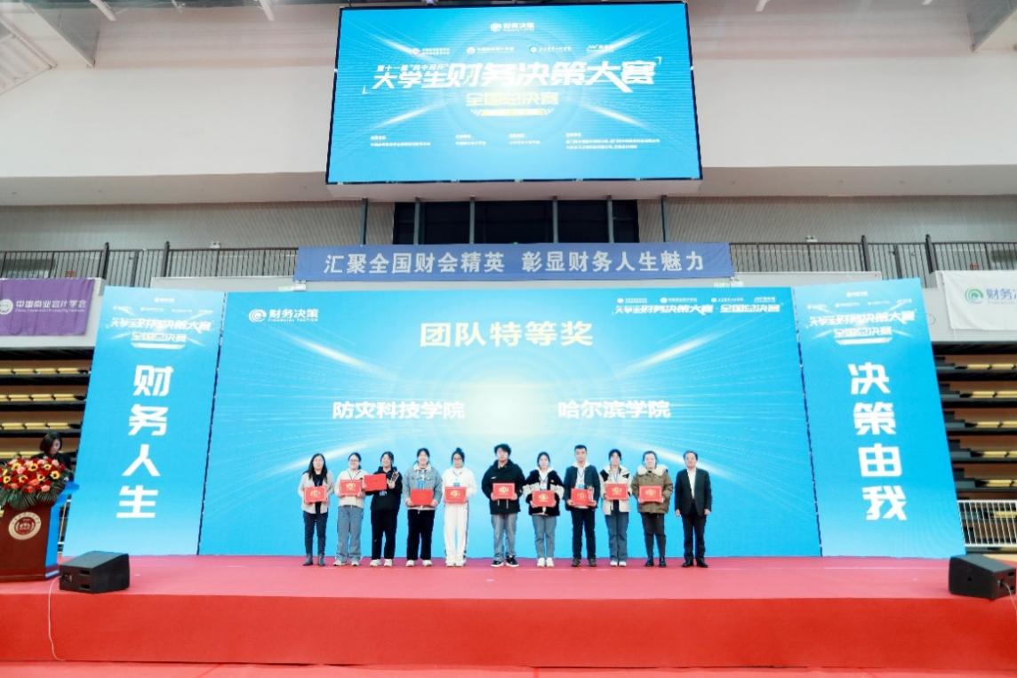12月8-9日,第十一届大学生财务决策大赛全国总决赛在山东淄博举行,学校会计学专业学生胡雨璇、张春宇、孙雯雯、冯雨欣组成的代表队参赛。经过连续7个小时封闭式的激烈角逐,学校代表队再上新台阶,最终以全国总决赛第一名的成绩拔得头筹,获得大赛特等奖,指导老师刘翠侠、袁庆禄获得“优秀指导教师”称号。