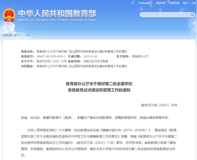 近日,经学校申报、河北省教育厅遴选推荐、专家复核、教育部综合认定并公示,第二批全国急救教育试点学校名单最终确定,学校成功入围。