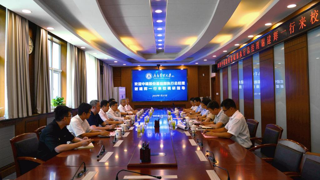 7月27日上午,中国建筑股份有限公司基础部执行总经理谢建辉,中建安装华北区域总部总经理张中华,中建方程北京公司党委副书记、工会主席王帅等来校调研座谈。联合党委书记卜昌森主持会议,联合党委常委、副校长顾秀根,联合党委常委韩国波出席会议。
