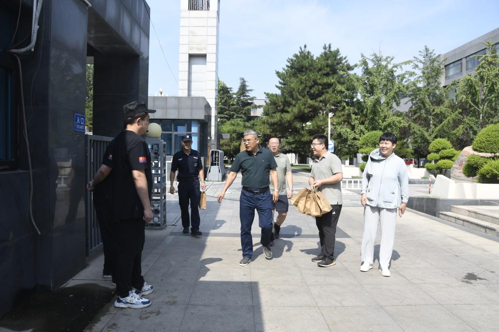 校领导一行首先看望了守护校园安全的一线安全保卫人员,叮嘱他们做好防暑降温和自我保护,并对他们始终坚守岗位,维护学校的安全、稳定、有序表示感谢。