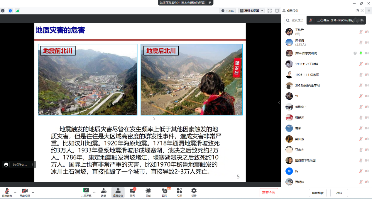 讲座分四个单元,分别由应急管理部国家自然灾害防治研究院许冲、中国地震局地震预测研究所张盛峰、防灾科技学院罗青山和中国地震应急搜救中心刘军主持。来自中国地震局地球物理研究所、中国地震局地质研究所、应急管理部自然灾害防治研究院、中国地震局地震研究所、深圳防灾减灾技术研究院、中国科学院空天信息创新研究院、北京工业大学、深圳防灾减灾技术研究院、学校等单位23名青年导师,围绕防震减灾、防灾减灾救灾及应急救援等领域的新理论、新技术和新方法作学术报告。我校在校研究生、拟录取的2023级硕士研究生参加了讲座。