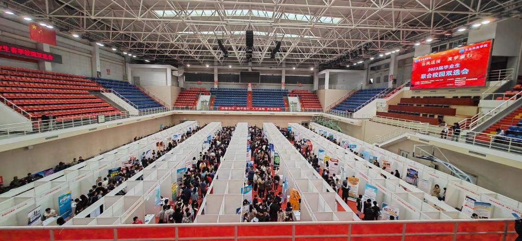 4月20日下午,由学校与三河市人社局和燕郊高新区人力资源管理局联合举办的“春风送岗·筑梦前行”2023届毕业生联合校园双选会在西院南校体育馆成功举办。本次双选会共邀请北京、天津、河北等10余个省(自治区、直辖市)的203家用人单位参加,涵盖了应急、地震、地质、建筑、煤炭、机电、计算机、金融、服务业等多个行业领域,累计提供招聘岗位4413个。近2500余名毕业生参加了校园双选会,学校相关部门负责人、各二级学院党政负责人、专业主任、学生辅导员到场与用人单位深入交流,了解、指导毕业生充分就业,部分年级的学生也到场观摩、体验双选会。