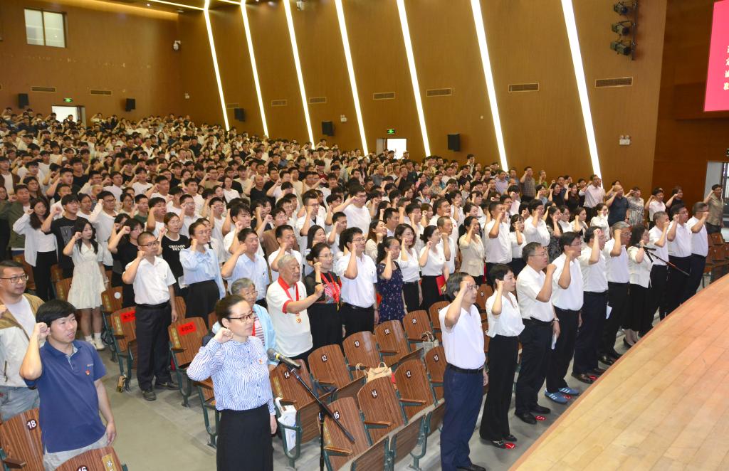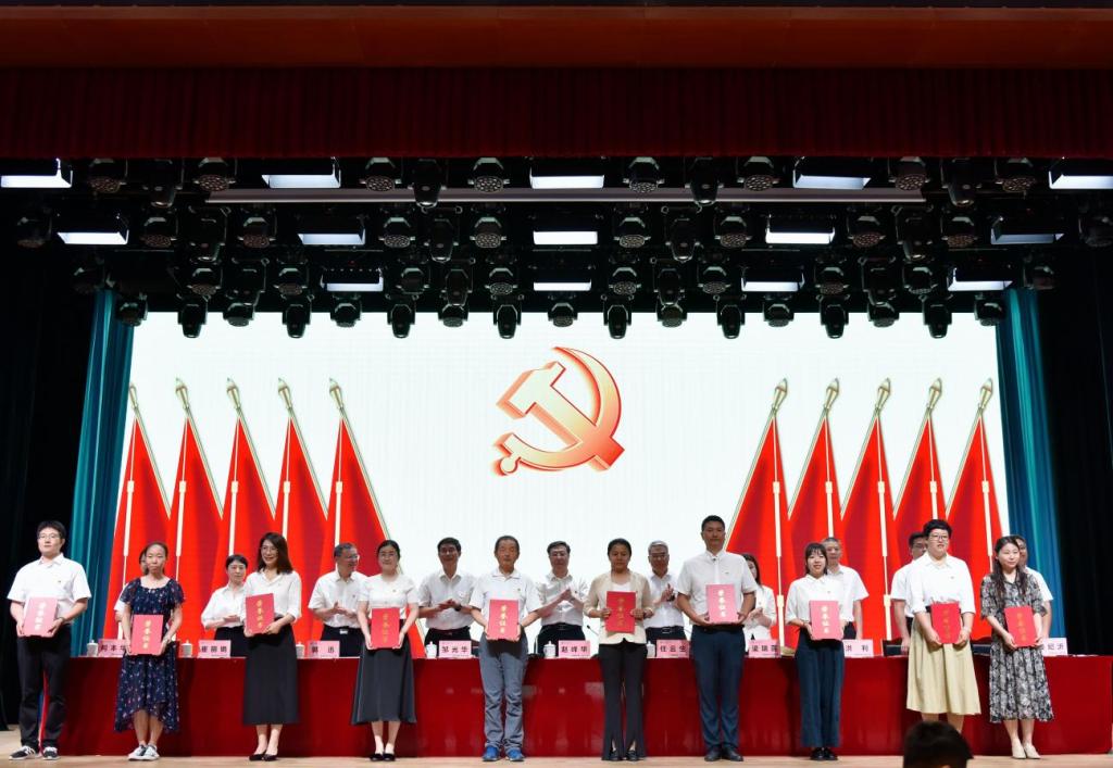 优秀党务工作者代表丰俊功、先进基层党组织代表王爱玲同志先后发言。党委组织部部长沈新颖领誓,全体党员重温入党誓词。