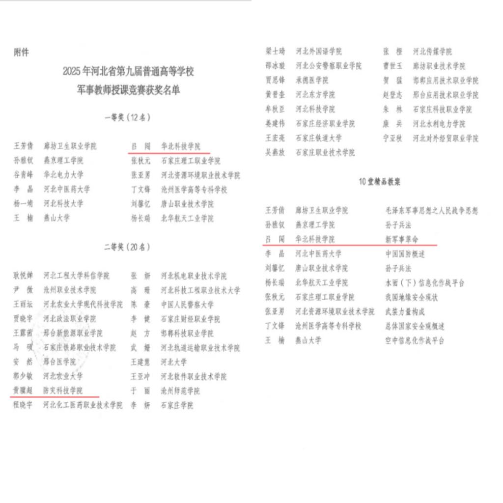 近期,河北省公布了7月在河北省军区综合训练队举办的第九届普通高等学校军事教师授课竞赛结果。我校信息与控制工程学院吕闯老师获一等奖,地球科学与工程学院黄骥超老师获二等奖,吕闯老师的课件获得精品教案并将教案电子版下发各学校,用以学习借鉴。