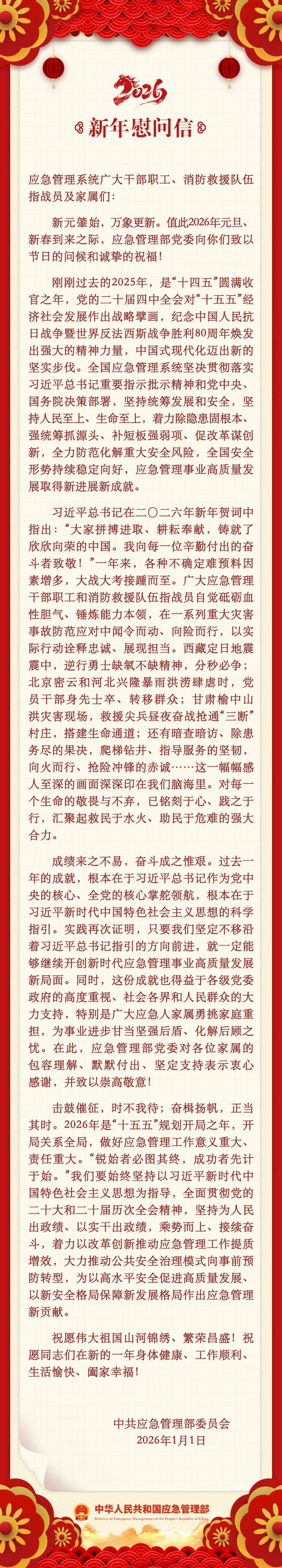 应急管理部2026年新年慰问信